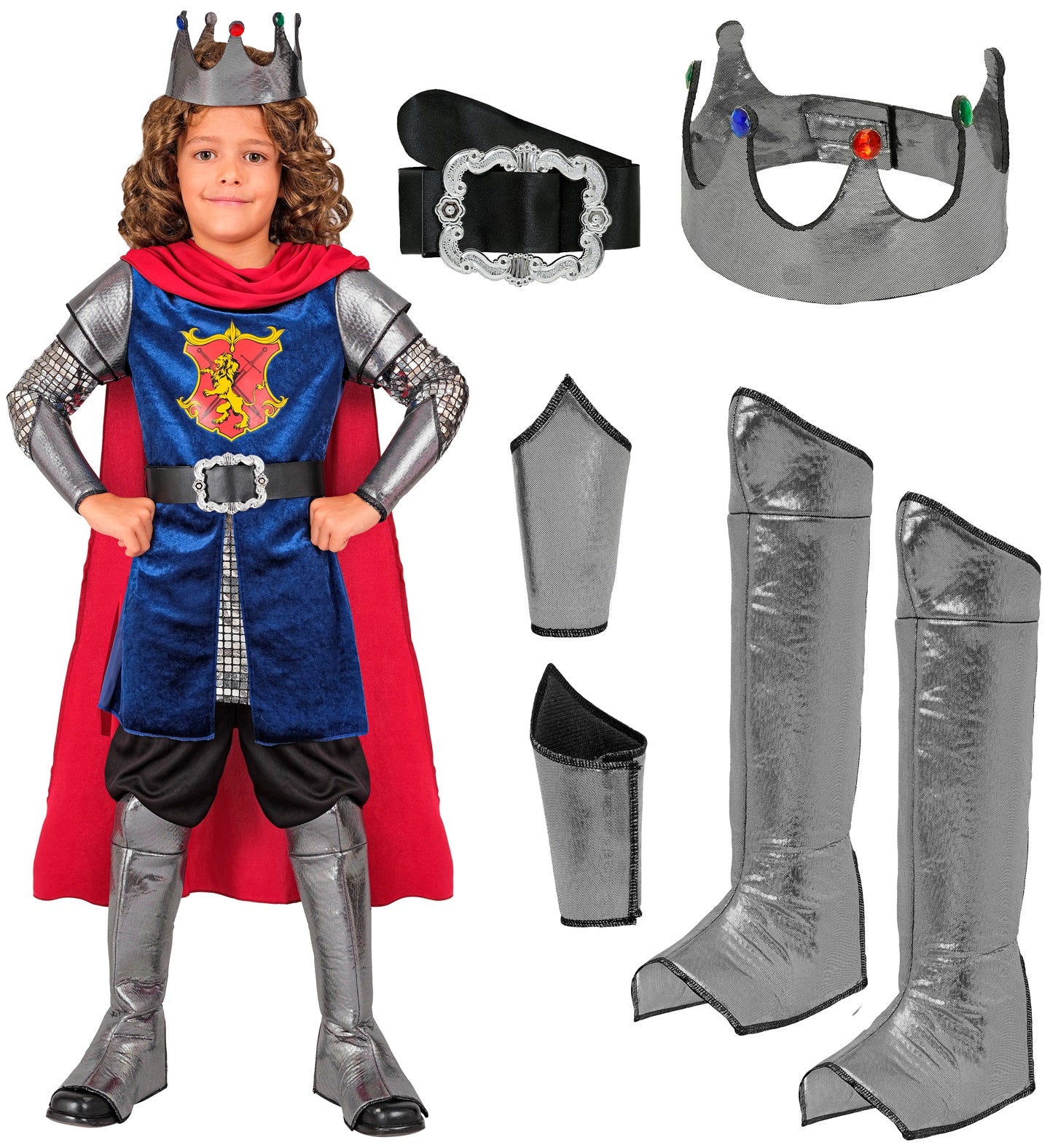 Jungen König Kostüm mit Oberteil mit Umhang, Gürtel, Armstulpen, Krone, Stiefelüberzieher